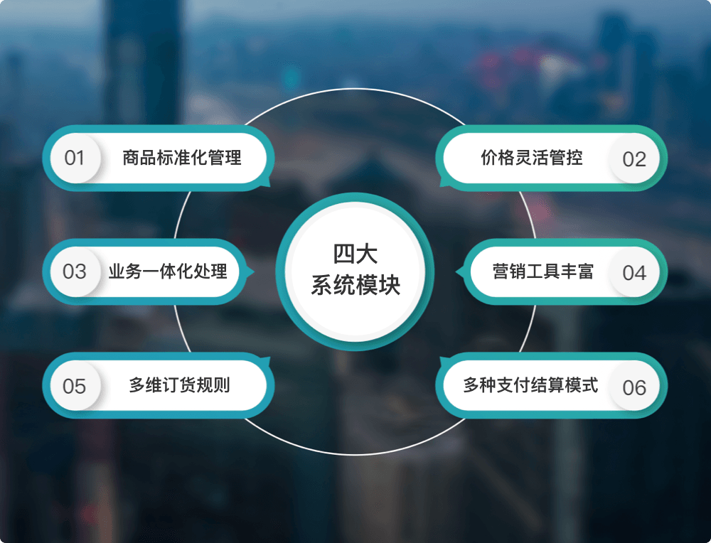 4大系統(tǒng)模塊:在線商城、業(yè)務(wù)ERP、訪銷CRM、分揀配送