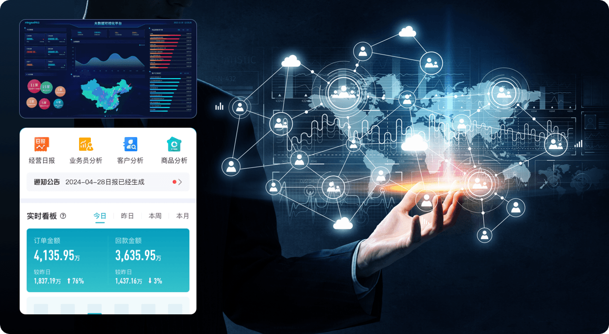 通過大數據、AI分析您的業務,為您提供全方位的經營分析,讓您可以實時掌握目標達成情況、分析業務波動原因、了解員工業務進展、即時發現客戶風險、庫存風險等,讓管理更加簡單透明!